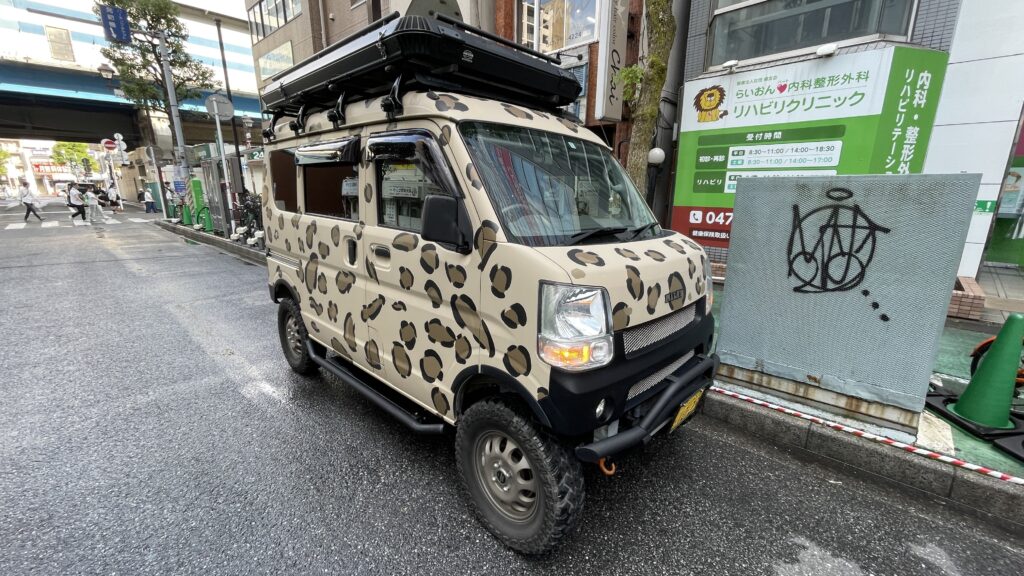 ヒョウ柄の4インチリフトアップカスタムした軽バンです。
