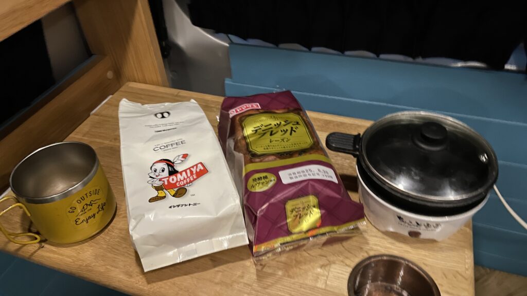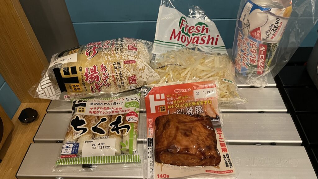 来る前にドンキホーテで買ってきた食材で車中飯です。