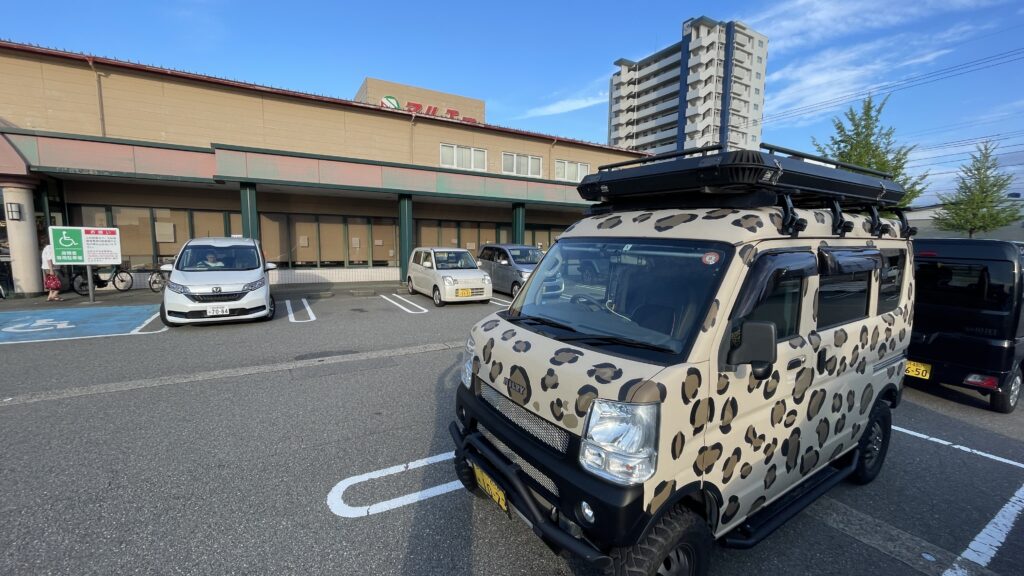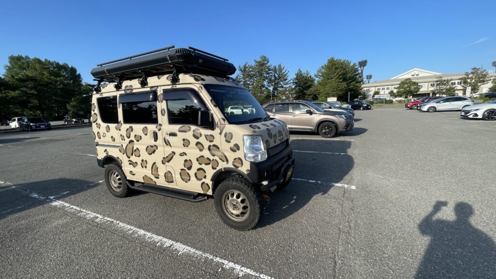 ヒョウ柄の4インチリフトアップカスタムした軽バンです。