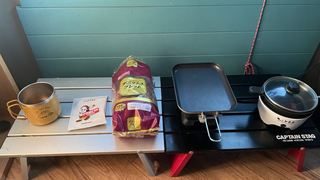 朝食は、ドンキホーテで買っておいたレーズンデニッシュブレッド。