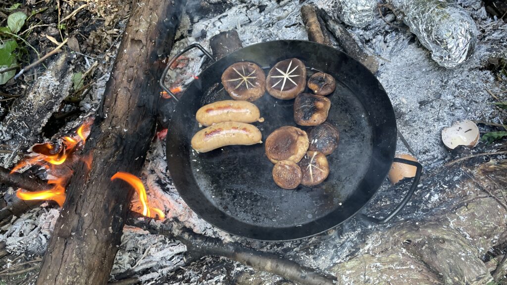 ソーセージとしいたけを焼きます。