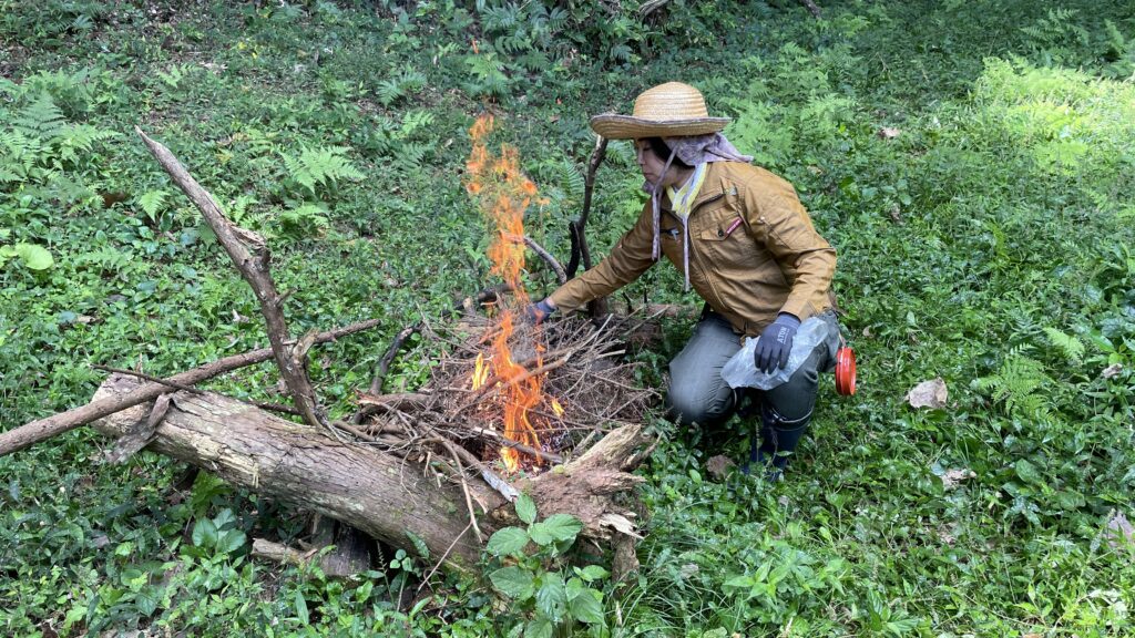 5. ドラム缶焼却炉で崩壊した縄文式竪穴住居や山林頂上の雑草を燃やし尽…