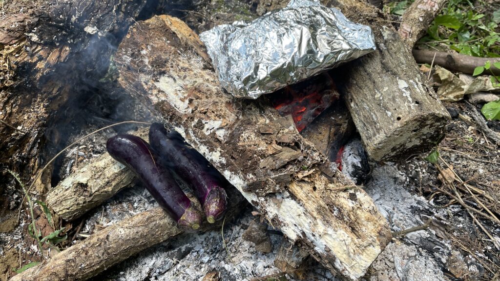 ナスはダイレクトに焚き火の薪の上に乗せました。