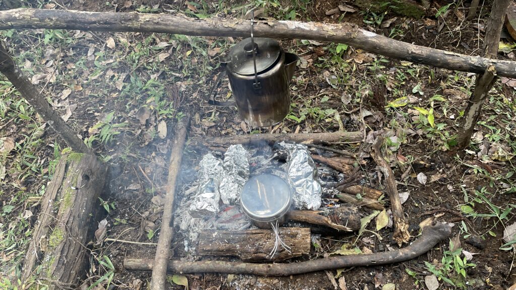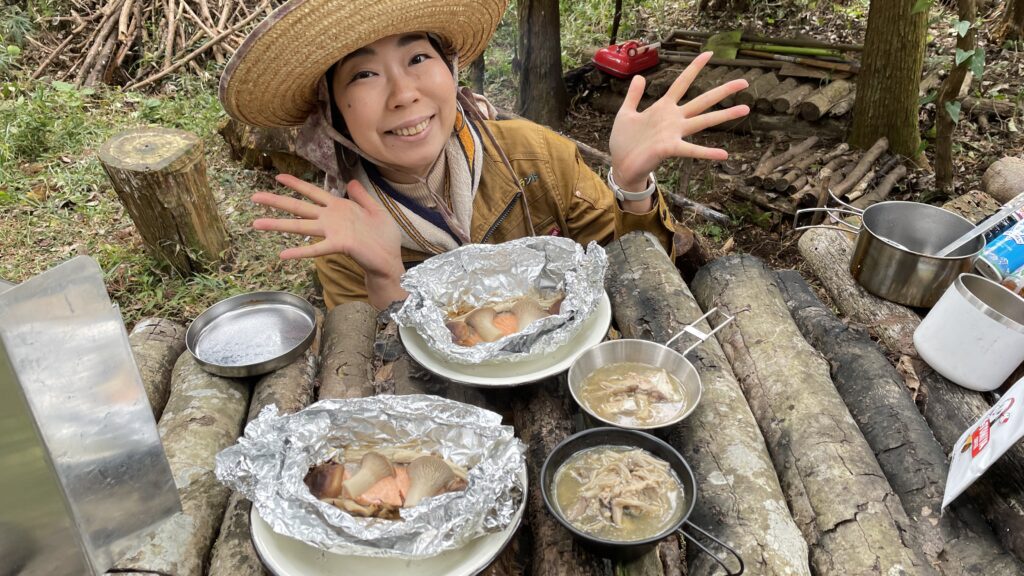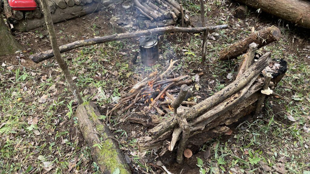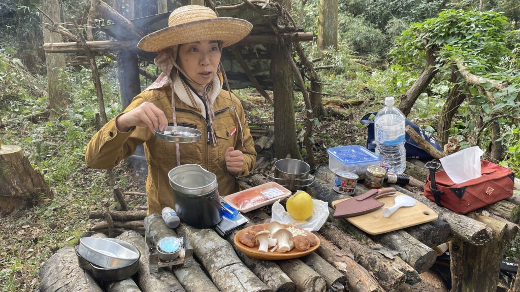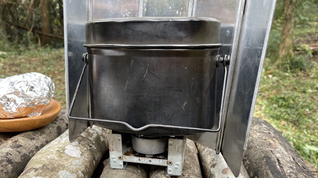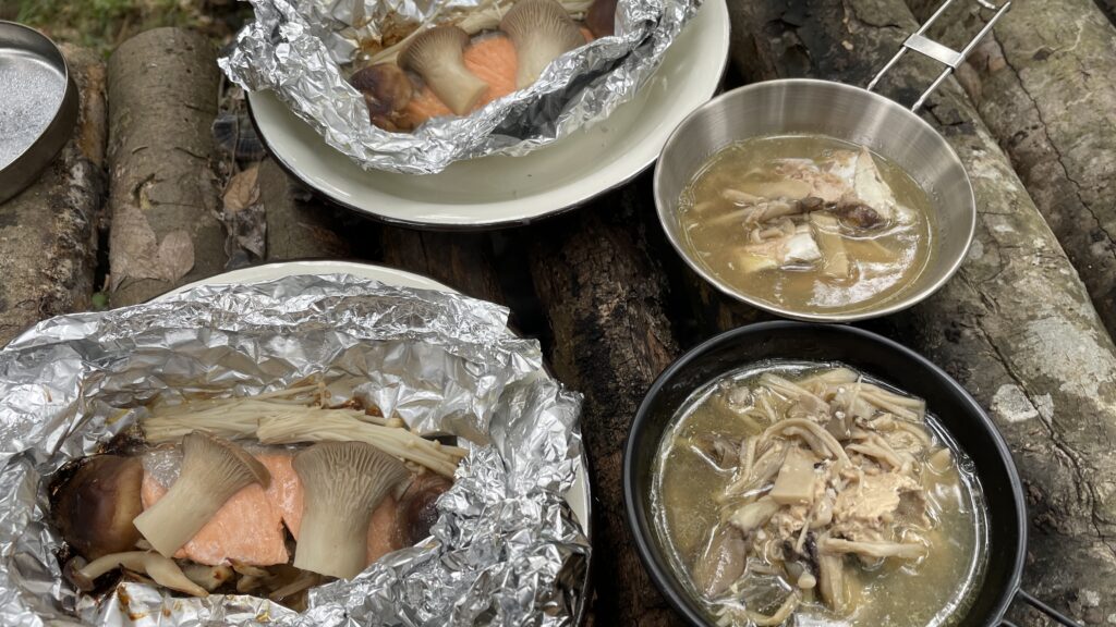 焚き火でお湯を沸かし、サバ缶とキノコのスープを温めます。