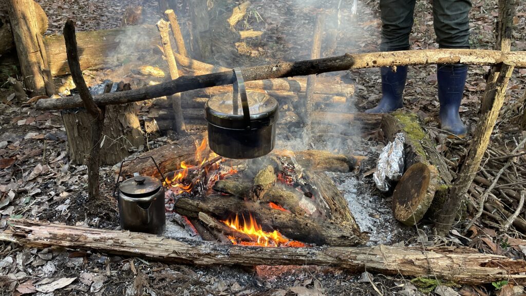 焚き火で鍋とヤカンを温めます。
