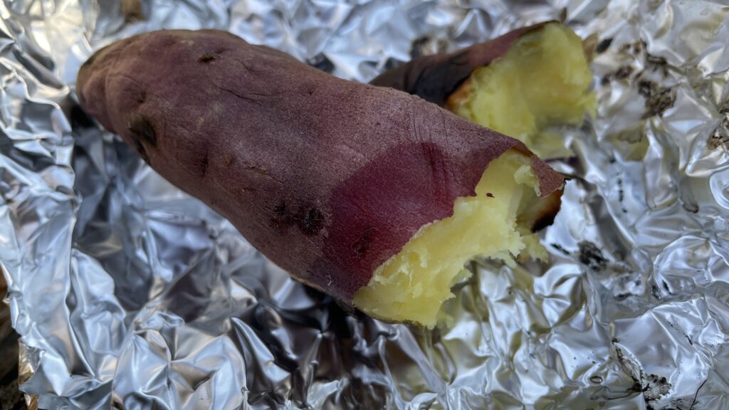 アルミホイルに焼き芋を包んで焼きました。