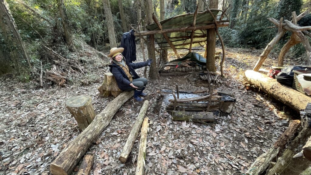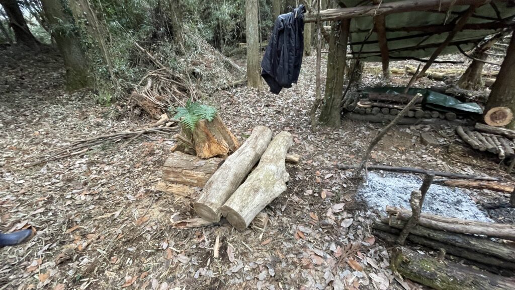 倒木をカットした丸太を2本ならべて、切り株の背もたれもつけました。