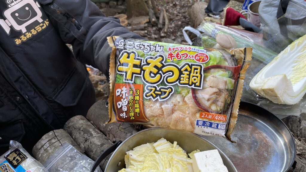 今回は焚き火で牛もつ鍋をやりました。