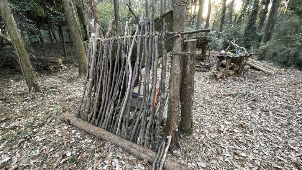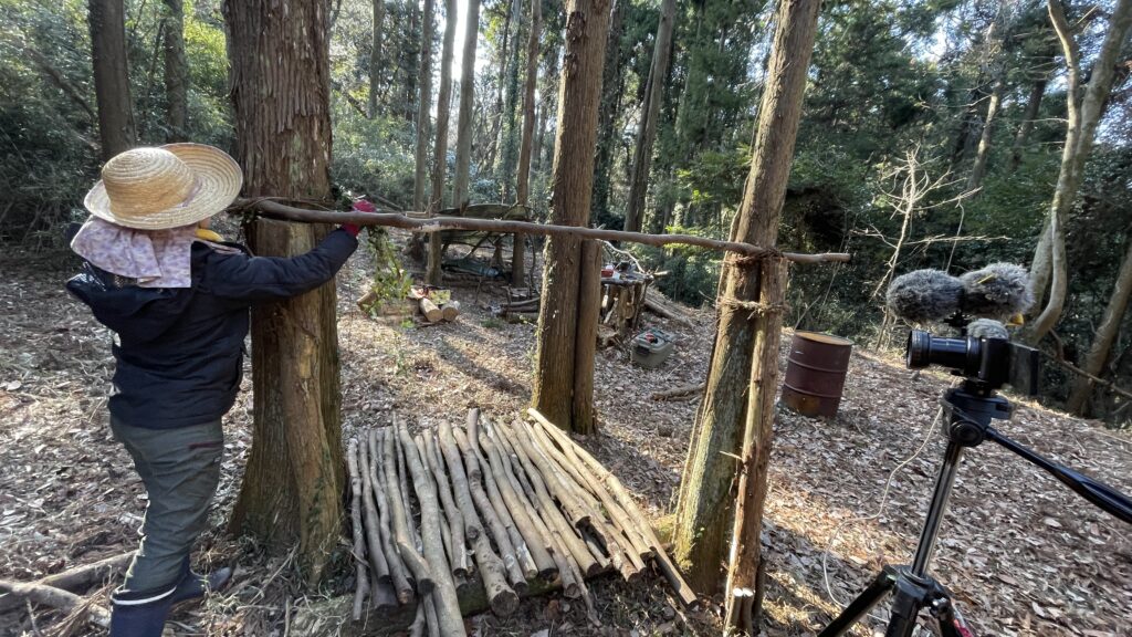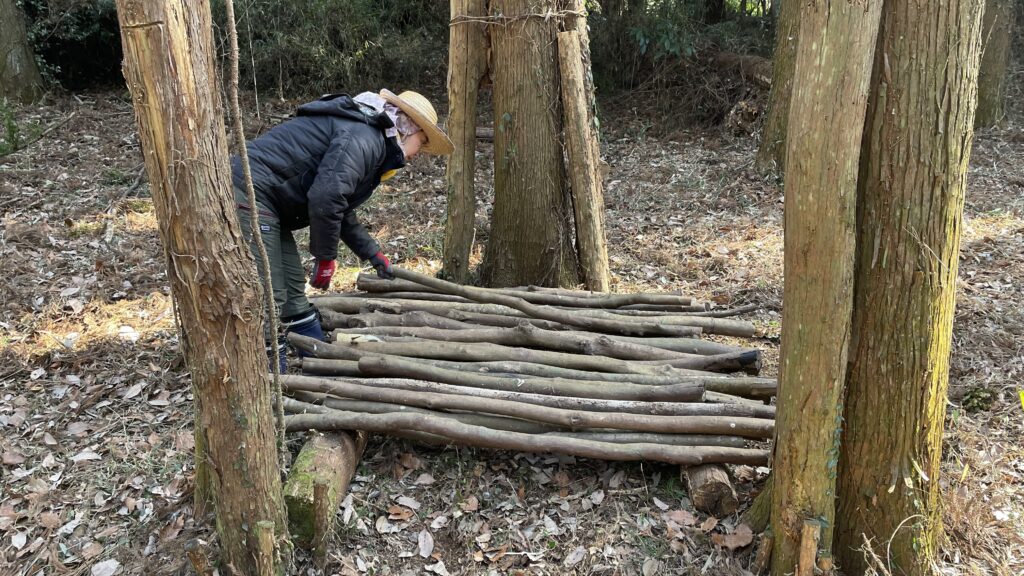 縄文式竪穴住居で使っていた材料も再利用して、壁として枝を立てかけました。