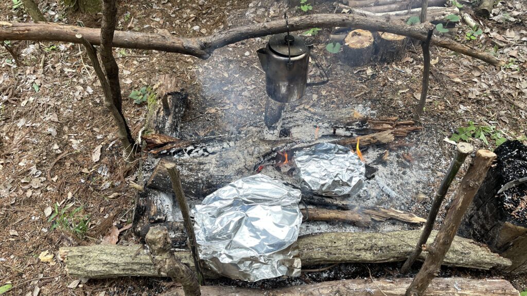 焚き火の音を聴きながら、外で食べる熱々の料理は格別な美味しさですね。