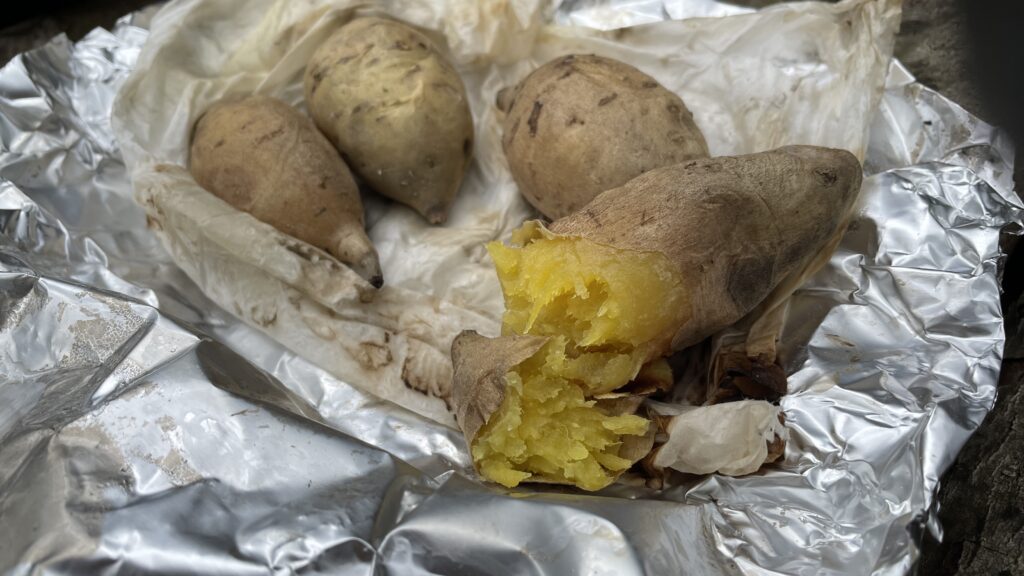 最後は、じっくりと焚き火で焼いたサツマイモ(芋藩のまこと)をデザートに。
