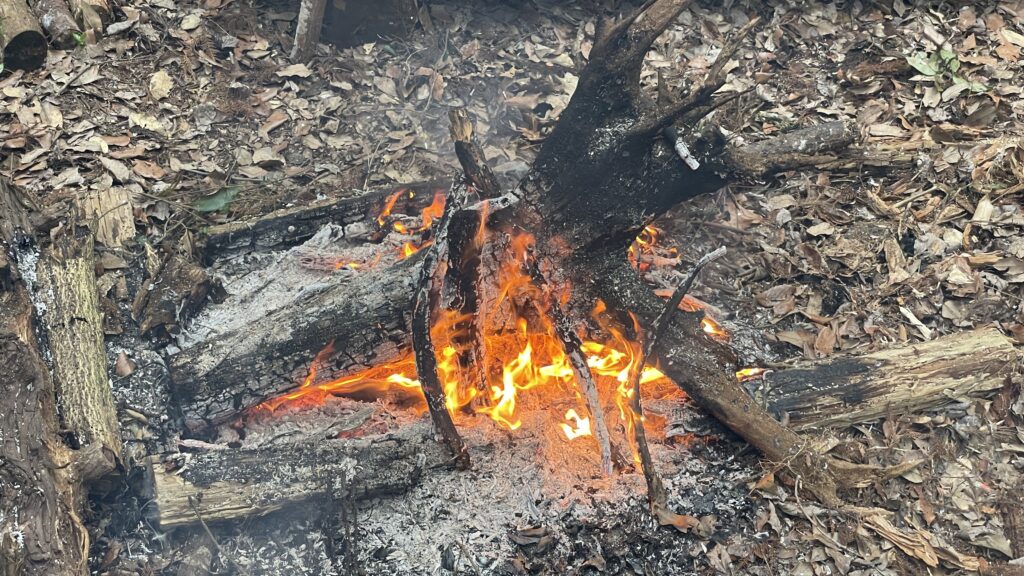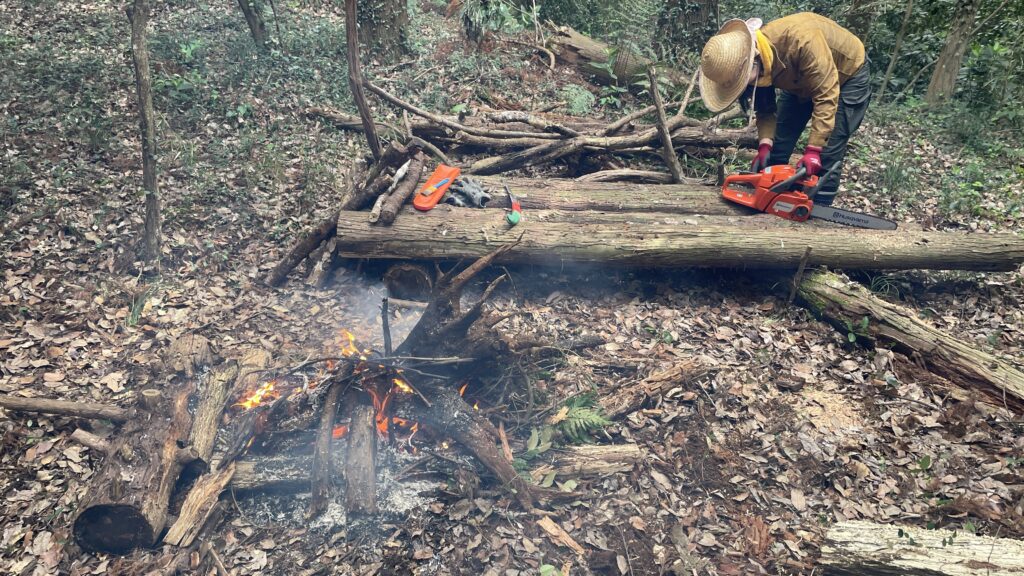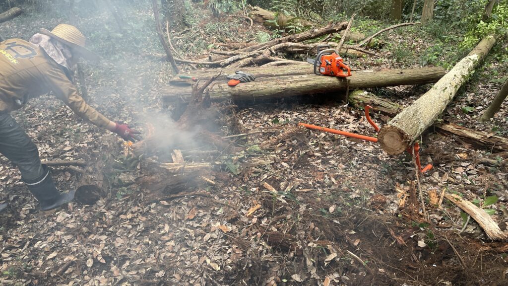 チェーンソーでカットした根っこの部分は焚き火で燃やします。