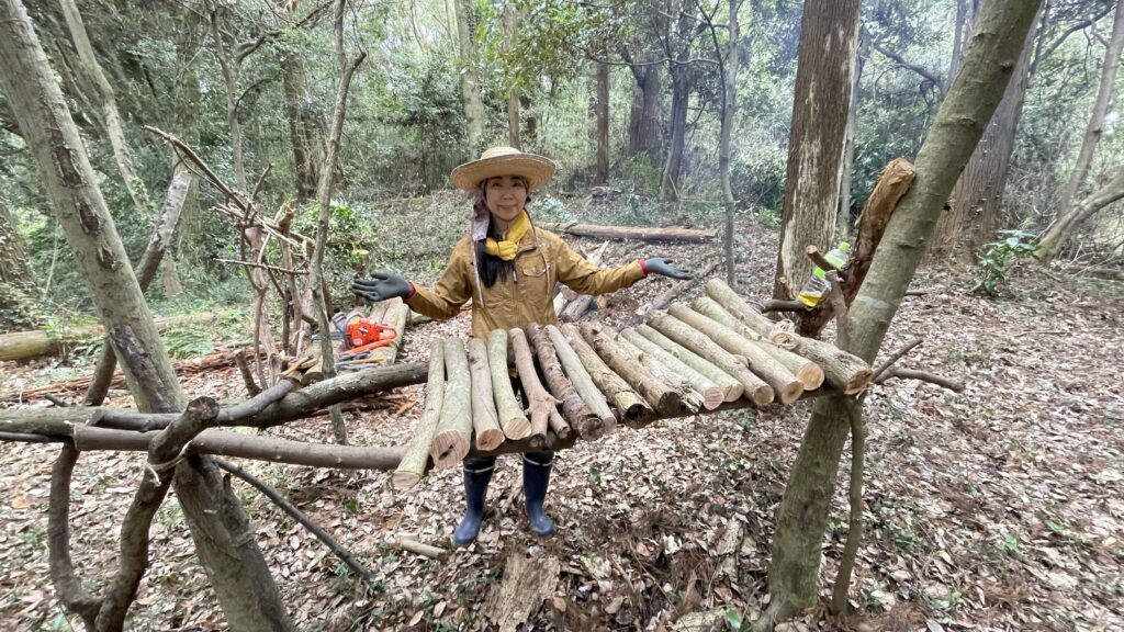 そこで、安全のために立ち枯れていた木をチェンソーで切り倒し、その丸太を再利用して修復作業を開始!